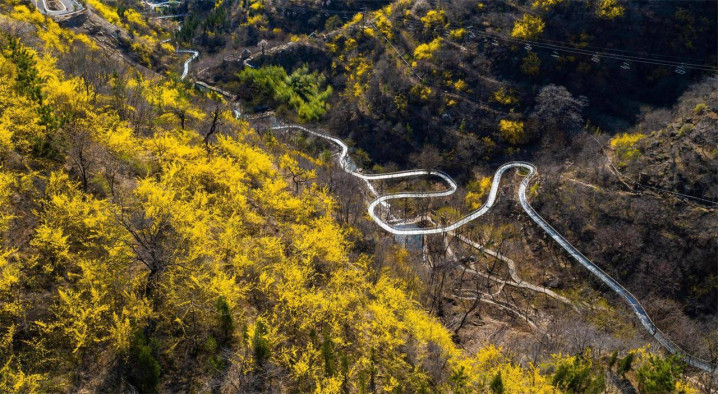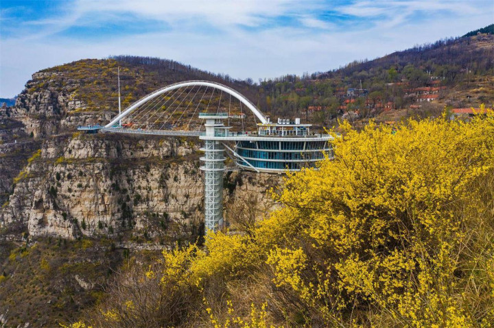 在玻璃桥上眺望远山,千亩连翘花海如金色瀑布从山顶倾泻而下,登山赏花,如诗如画。